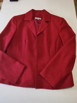 Precioso y cómodo traje de entretiempo mujer. Talla 44 España. - Diseño elegante y moderno. - Color rojo/burdeos. - Poliéster / Lino. Largo pantalón 100 cm Ancho hombro a hombro 40cm Largo chaqueta 65cm. Dos bolsillos frontales verticales. Cierre chaqueta con corchetes.