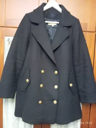 Elegante chaquetón de paño. - Diseño de doble botonadura. - Cuello clásico. - Bolsillos frontales con solapa. - Detalle de botones en los hombros.