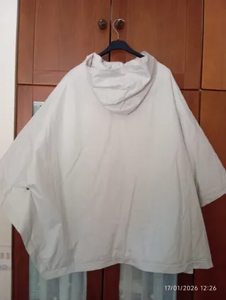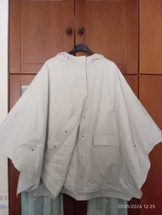 Prenda de estilo capa en color beige, con un diseño amplio y moderno. - Diseño tipo poncho. - Cierre de botones a presión. - Bolsillos frontales. - Capucha integrada.