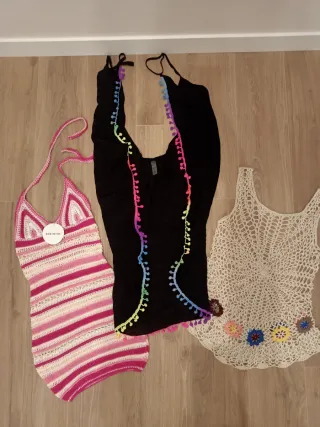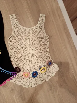 Conjunto de tres prendas de ropa de mujer, estilo crochet. - Prenda de tirantes con detalles de pompones de colores. - Prenda de tirantes con diseño de flores. - Prenda de tirantes a rayas.