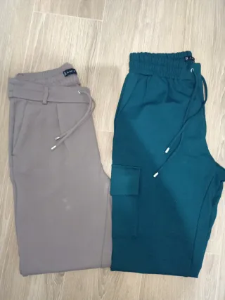 Conjunto de dos pantalones de mujer, uno gris y otro verde . - Pantalón gris con cinturón de tela y cordón. - Pantalón verde estilo cargo con bolsillos laterales y cintura elástica.