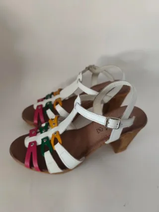 Sandalias de chica con un diseño alegre y juvenil en el N°35 de Jordana. Sin caja original. En muy buen estado. - Tira central con hebilla ajustable. - Tiras de colores vibrantes en la parte delantera. - Tacón de altura media.