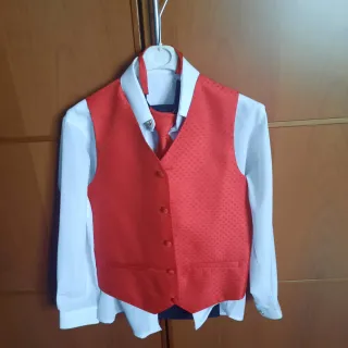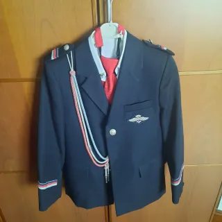 Traje de comunión para niño, elegante y completo. - Chaqueta azul marino. Talla 10 - Corbata roja con puntos. - Chaleco rojo. - Camisa blanca. - Pantalón azul marino. - Cordón decorativo con los colores de la bandera. - Insignia de aviación en el pecho. - Detalles de rayas en puños y hombros. - Zapatos negros talla 35