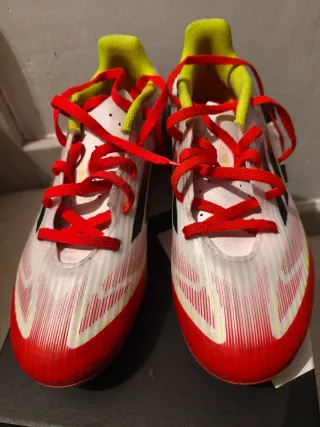 Botas de fútbol Adidas con cordones rojos y detalles llamativos. - Diseño con franjas Adidas en negro. - Forro interior en color amarillo. - Suela con tacos para césped. Compradas hace 2 semanas y puestas una sola vez para entrenar, pero le quedaban un poco justas y tuvimos que coger otra talla mayor. Al estar usadas una vez ya no se pudieron devolver.