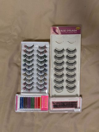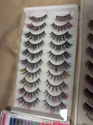 Variedad de pestañas postizas y extensiones para diferentes estilos. - Incluye varios pares de pestañas postizas de distintos modelos. - Contiene extensiones de pestañas individuales en varios colores vibrantes.