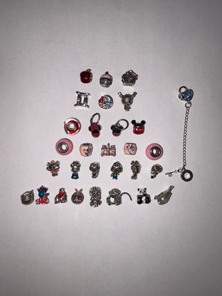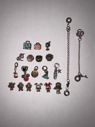 Conjunto de charms para pulsera. - Charm de corazón con lazo. - Charm de Minnie Mouse. - Charm de Stitch. - Charm de Koala con bandera. - Charm de mariquita. - Charm de Pluto. - Charm de candado con cadena y llave.