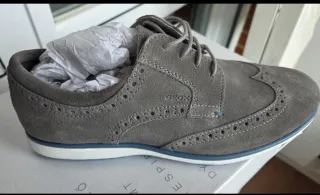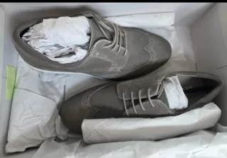 Elegantes zapatos de ante en color gris. - Diseño tipo Oxford con detalles perforados. - Cierre de cordones. - Suela de goma con detalles en azul. - No se han estrenado.