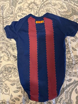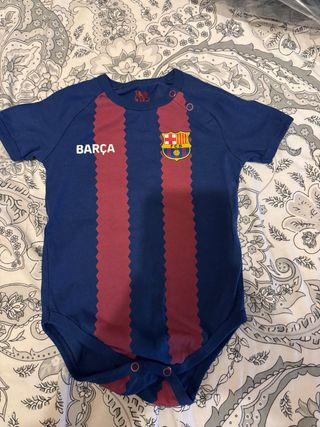 Body de bebé con el diseño del FC Barcelona. - Rayas verticales rojas y azul. - Escudo del club en el pecho. - Cierre de botones a presión. Usado una vez talla 12 meses