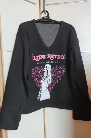 Sudadera con un diseño original de esqueleto y flores. Muy amplia, sisa 54 cm - Estampado frontal con texto Aíre Retro y eres mi sitio favorito. - Cuello en V.