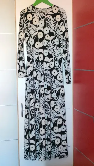 Vestido largo con un llamativo estampado floral . Tejido elástico hasta una 85-90.pecho - Diseño de manga larga. - Corte maxi. - Estampado de flores y hojas.