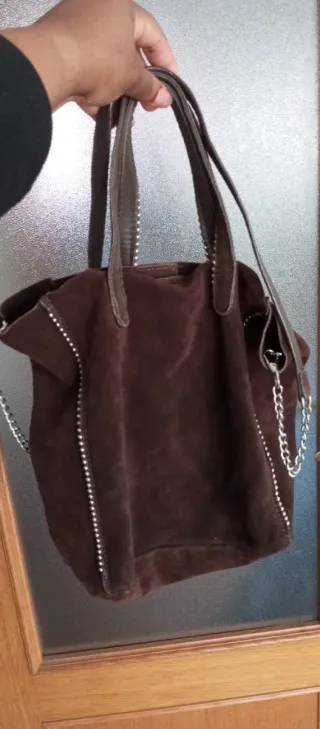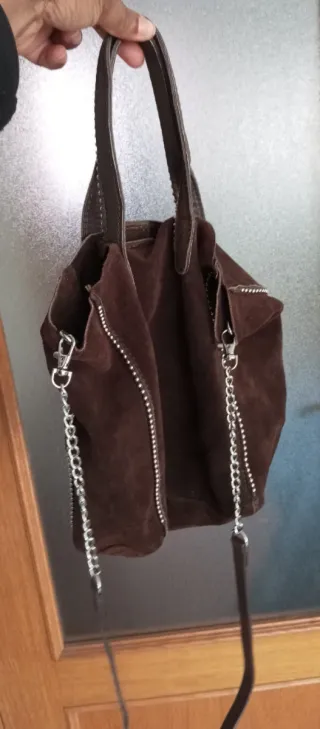Bolso de mano o al hombro en ante marrón. Presenta un diseño moderno con detalles de cremallera y cadena. - Material: Ante - Color: Marrón - Adornos: Cremalleras y cadena metálica - Asas: Dobles asas de cuero