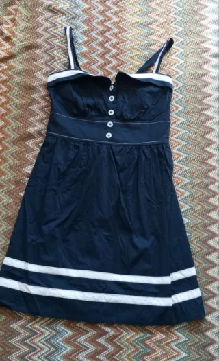 Vestido de verano con un diseño encantador. - Tirantes finos. - Detalle de botones en la parte delantera. - Fajín con pespuntes. - Dobladillo con dos bandas blancas.