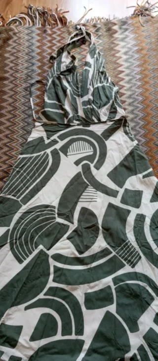 Vestido de verano con un estampado original. - Diseño con cuello halter. - Largo hasta la rodilla. - Tejido ligero y transpirable.