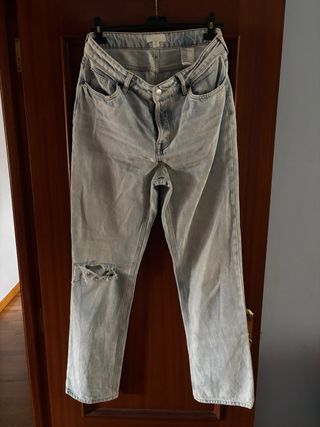 Pantalón vaquero de corte recto con un diseño moderno y desgastado. - Cintura alta. - Piernas anchas. - Detalle de rotura en la rodilla izquierda. - Cierre de cremallera y botón.