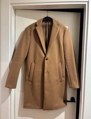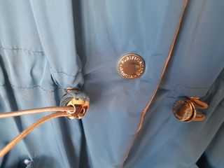 Abrigo largo reversible con cuello alto. - Un lado en tono marrón. - Otro lado en tono azul. - Cierre de botones dorados. - Bolsillos laterales. - La medida de sisa a sisa 62cm. de largo 92cm.