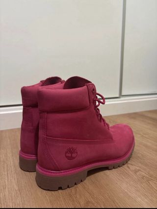 Botas Timberland em couro, edição especial de coleção. - Cor rosa vibrante. - Detalhe do logo da Timberland na lateral. - Cadarços na mesma cor.