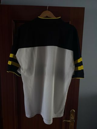 Camiseta de manga larga con un diseño moderno y llamativo. - Cuello en V con ribete amarillo. - Banda horizontal negra en el pecho con logo. - Mangas con detalles de rayas amarillas.