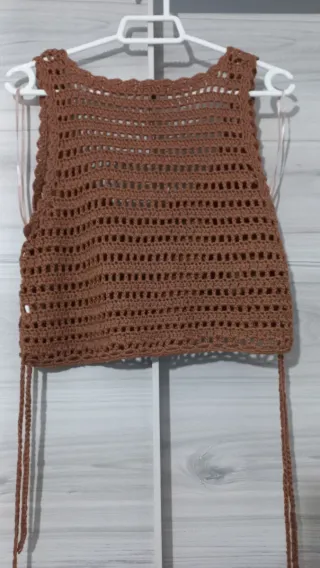 Crop top de tejido crochet en color marrón, talla S/M. Diseño abierto y con tiras para atar. - Tejido de crochet. - Tiras laterales para ajustar.
