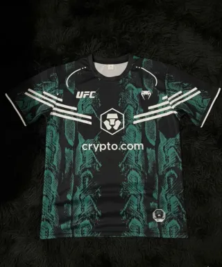 Camiseta deportiva con diseño llamativo. - Estampado de serpiente en verde y negro. - Logo de UFC en el pecho. - Logo de Crypto.com en el centro. - Detalles blancos en las mangas.