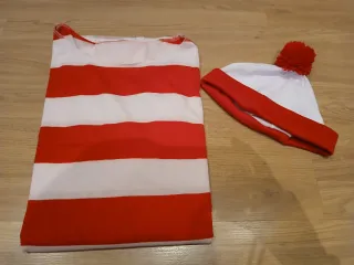 Disfraz Wally. - Camiseta de manga larga con rayas horizontales rojas y blancas. - Gorro a juego con pompón rojo.