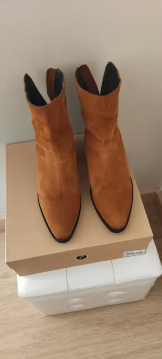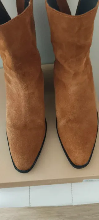Botines de ante en color marrón, perfectos para añadir un toque de estilo. - Material: Ante - Diseño de caña media - Punta afilada - Tacón de bloque -Altura 7 cm _Interior piel Usadas un único día