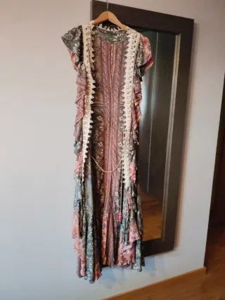 Preciosa túnica larga con un estampado vibrante y detalles de encaje. - Diseño estilo boho. - Mangas cortas acampanadas. - Varios volantes en la falda. - Cierre con cordón fino. Para llevar con cualquier vaquero, pantalón corto, otro vestidos... Estilo seda.