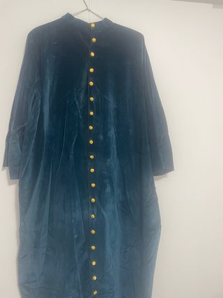 Túnica estilo Maria Magdalena, con un diseño elegante y llamativo. - Confeccionada en terciopelo. - Color verde azulado intenso. - Cierre frontal con botones dorados. - Cuello mao.