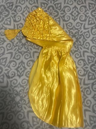 Túnica de nazareno talla XS con detalles dorados, Virgen del Rocio de Málaga. - Adornada con pasamanería dorada. - Cierre de botones. - Cingulo con borlas doradas incluido.