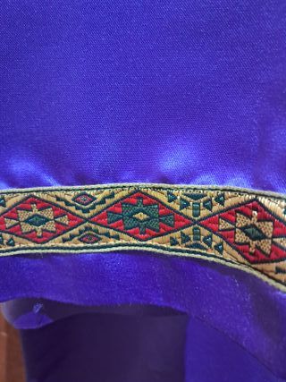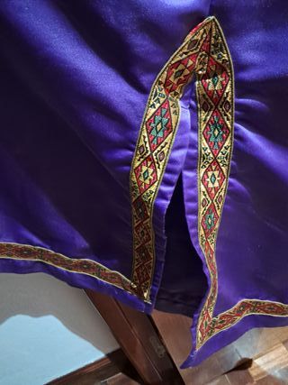 Túnica de Rey Mago con un diseño llamativo y detalles bordados. - Color base morado vibrante. - Borde decorativo con motivos geométricos en rojo, verde y dorado.