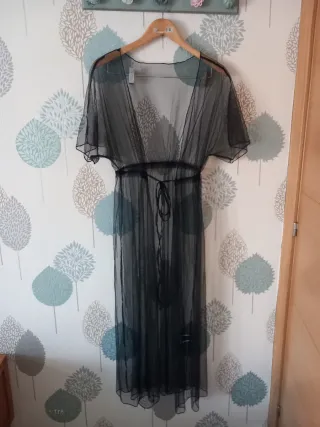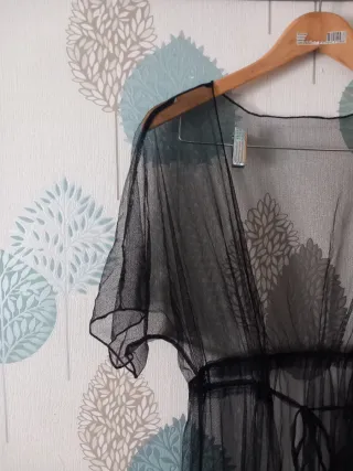 Elegante túnica transparente de Shein Perfecta para usar sobre trajes de baño o como prenda de capa. - Diseño largo y vaporoso. - Cinturón ajustable para marcar la silueta. - Manga corta y escote en V. Esta sin uso