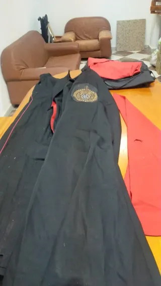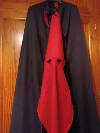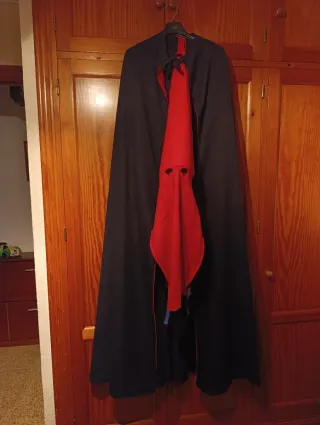 Conjunto de ropa de penitente que incluye túnica, capa y antifaz. - Túnica negra. - Capa negra. - Antifaz rojo. Ropa de penitente. Túnica+ capa+ antifaz (con capirote) Judíos de San mateo. Jerez de la frontera . Talla aproximadamente: Altura 175 Contorno de cadera 128cm Hombro a hombro 44cm.