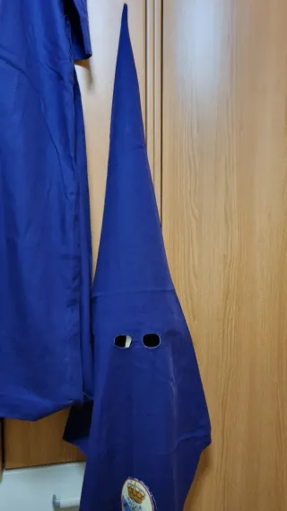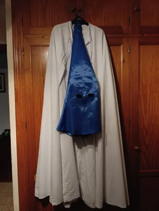 Conjunto de ropa de penitente que incluye túnica, capa y antifaz. - Túnica blanca. - Capa blanca. - Antifaz azul. Ropa de penitente. Túnica+ capa+ antifaz (con capirote) Hermandad La borriquita. Jerez de la frontera. Talla aproximadamente Altura 175 contorno de cadera 120cm hombro a hombro 44cm