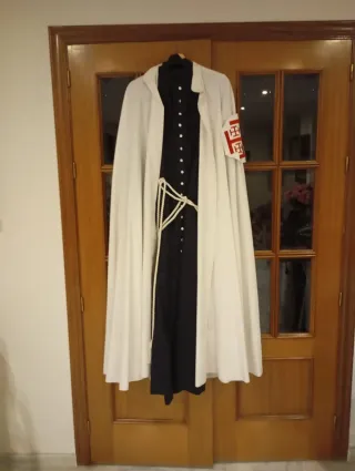 Túnica de nazareno completa, lista para usar. - Capa negra con cruz blanca. - Caperuza negra. - Cordón negro con borlas. - Puños negros. Hermandad Soledad de San Lorenzo Está completa y en buen estado, alguna mancha de cera pero nada que no se pueda limpiar