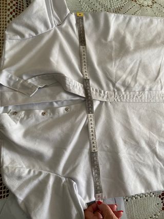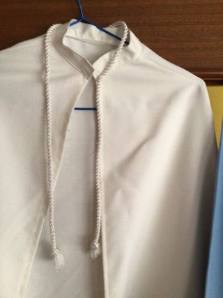 Túnica con cola de color blanco. Usada.Sarga de la que ya no encontramos. Medidas 105 de largo, 43 de manga y 50 de espalda ( axila a axila). Para Hermandades como Borriquita, San Gonzalo, Candelaria, Bofeta, ...... - Cuello mao. - Cierre de botones. - Manga larga.