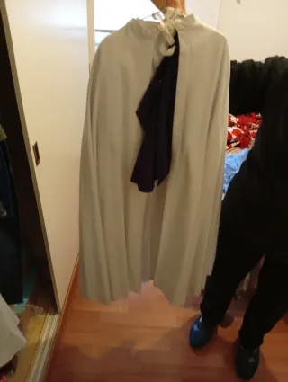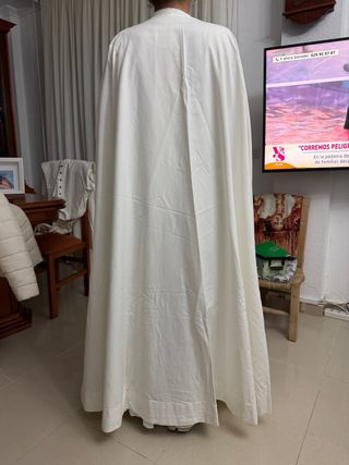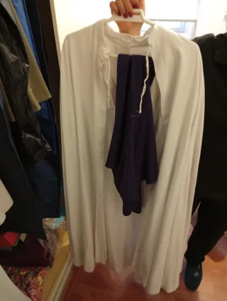 Conjunto de túnica y capa para San Juan y la Virgen. - Túnica blanca con cordón, si la quieres para otra hermandad yo te la termino, pues por delante de arriba a abajo lleva tela del color de la hermandad. Largo desde el hombro 120 y tunica largo 110, ancho por las axilas 96, largo mangas 50 cm. Y la vendo por 55€. Capa por 50 €. Mas el arreglo 10€. Tengo capuces blancos y negros a la venta. Palos de niños y adultos.