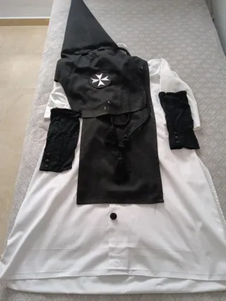 Conjunto de túnica y accesorios. - Túnica negra. - Gorro blanco con detalles negros. - Cuerda decorativa. - Sandalias negras.Regalo cingulo y sandalias 37 ,Para talla de 1,60 a 1,80 ajustable..