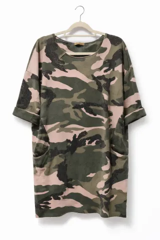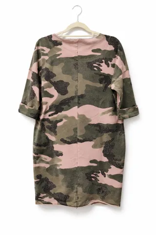 Túnica de estilo oversize con un llamativo estampado de camuflaje en tonos verdes y rosas, con detalles brillantes. - Diseño de camuflaje. - Corte holgado. - Bolsillos laterales.