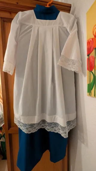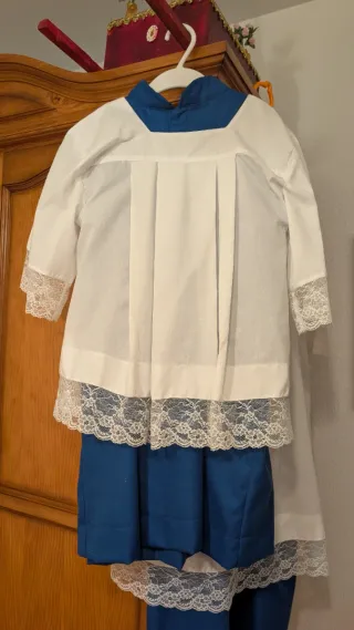 Conjunto de túnicas para monaguillo. - Túnica blanca con detalles de encaje. - Cuello azul. - Diseño con pliegues. 50€ la unidad