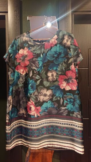Tunica muy bonita, con forro. Es poliester pero el tacto es tipo raso/seda. Ancho sisa a sisa 53 cm y largo 79 cm. Sin uso. Talla 44. Nuevo sin uso.