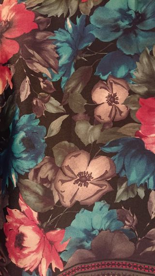 Tunica tipo bluson en negro estampado de flores. Ancho sisa a sisa 58 cm. Largo por delante 66 cm y 71 por detrás. Muy vistosa con un pantalón negro. Talla 46/48 (o 50 más ceñida al ser amplia). Tallas grandes. Como nueva.