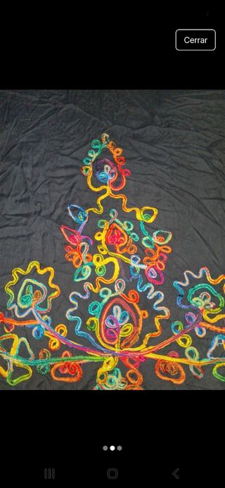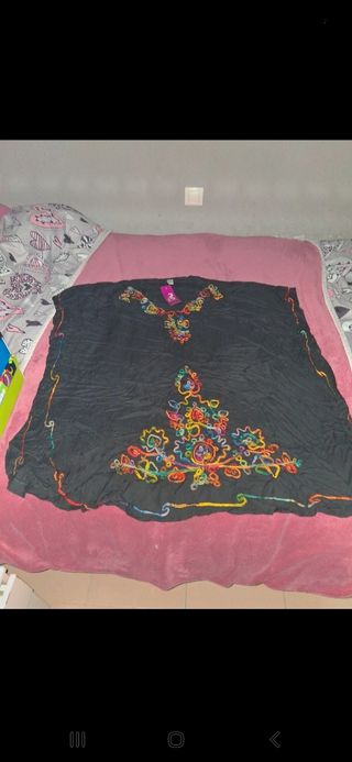 Preciosa túnica negra con bordados multicolor. Ideal para un look bohemio y veraniego. - Diseño único y llamativo. - Confeccionada en una tela ligera y fresca. - Perfecta para la playa o cualquier ocasión informal. -Da para bastante talla, preguntar medidas