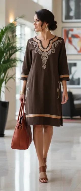 Túnica de lino marrón, ideal para un look veraniego. Es una prenda elegante y cómoda, perfecta para cualquier ocasión. - Diseño con bordados artesanales. - Manga tres cuartos. - Corte recto.
