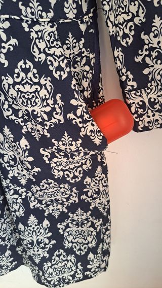 Túnica larga con un diseño llamativo y elegante. Pequeñas trazas por dentro pero no se ven por fuera( ver foto) - Estampado barroco en negro y dorado. - Cuello camisero. - Manga larga. - Cierre de botones.