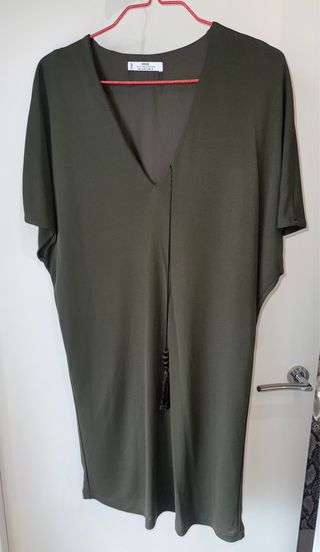 Sin estrenar. Vestido túnica con forro. Mango Talla S, color verde oliva oscuro. - Corte holgado y cómodo. - Detalle de cordón con borla en el escote. - Escote en pico pronunciado. - Manga corta tipo murciélago.