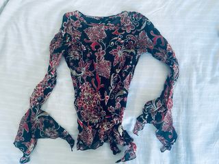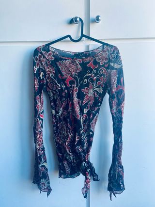 Túnica con un diseño floral y mangas largas acampanadas. Tejido ligero y vaporoso.