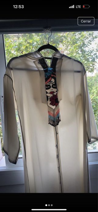 Hecho a mano . Túnica larga con un diseño frontal muy llamativo y bordado. - Diseño frontal con cuentas y flecos. - Borde de las mangas y abertura frontal con detalles. - Tejido ligero y vaporoso.
