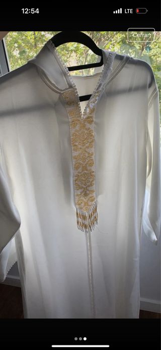 Túnica de estilo marroquí con un diseño elegante ,color marrón ydetalles en blanco. Es bastante grande . Procedente de Marruecos - Adornos blancos en el escote y el pecho. - Corte amplio y cómodo.