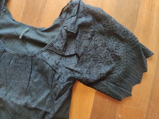 Top blusa tipo túnica de manga corta con escote redondo. El borde de las magas y de la base van bordados de manera densa, tipo bordado antiguo vintage retro, con dibujos vaciados (bordado inglés). El tejido de base va tramado haciendo rayas y topos. Mangas raglán. Corte trapecio / évasé / ancho. Forro interior en el cuerpo (no en las mangas). El tejido es suavo, con una mezcla de SEDA 51% y algodón 49%. Marca Nafnaf t. 38. En perfecto estado ! NO HAGO ENVÍOS POR WALLAPOP