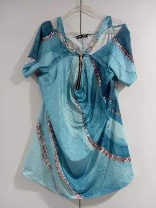 Túnica de estilo bohemio con un diseño llamativo. - Diseño con estampado abstracto en tonos azules. - Detalle de cadena dorada en el escote. - Cremallera frontal. - Mangas cortas. - Corte asimétrico.