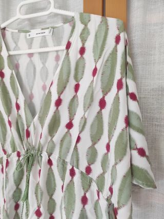 Túnica de playa corta, con un bonito estampado en verde, granate y blanco. De Women Secret, talla S. Una sola puesta. - Diseño con cuello en V. - Detalle de cordón ajustable en la cintura. - Mangas cortas tipo murciélago.